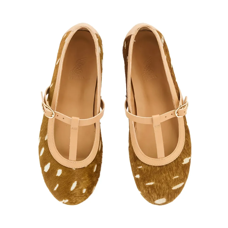 The ballerina is back. Our bestselling Aerati style features a feminine T-strap across the front and combines Vachetta leather construction with pony hair uppers. Choose from several animal prints. Note the signature wing-shaped buckle for adjustments.