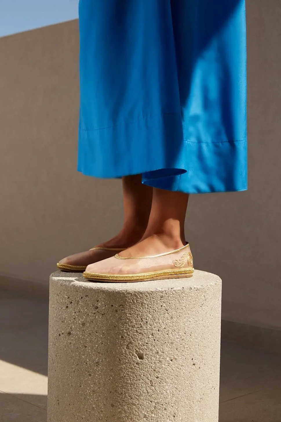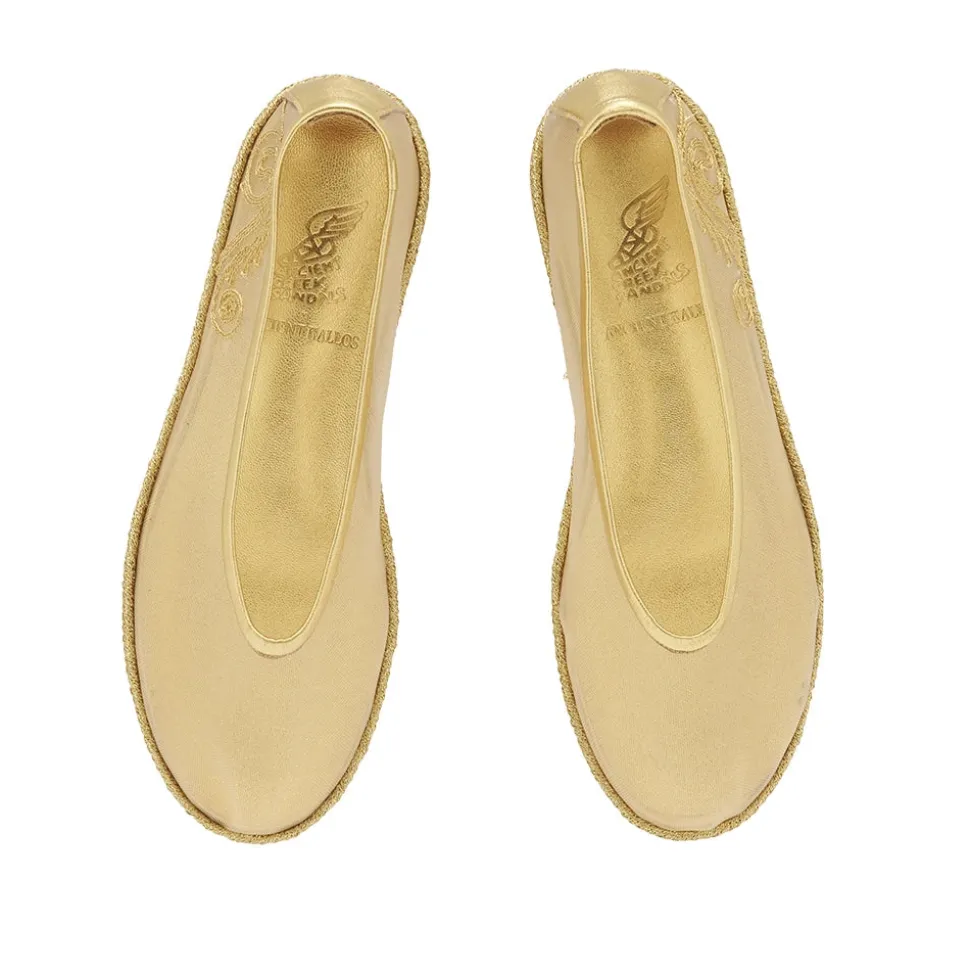 Created in close collaboration with sustainably-focused resort wear brand Ancient Kallos, this limited-edition soft slip-on ballet pump is adorned with traditional golden cord embroidery—a signature element of Ancient Kallos. The mesh uppers offer a lightness, meaning the shoe pairs elegantly with evening looks or even daytime denim. Channeling signatures from both Greek brands, including traditional craftsmanship, the shoe is a timeless tribute to craftsmanship, with a modern twist.