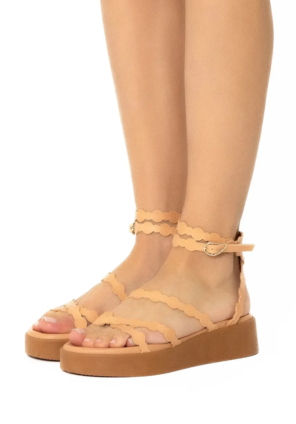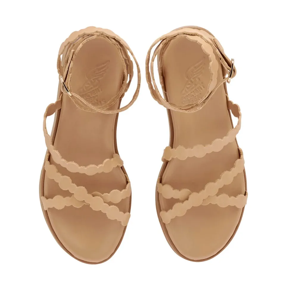 Aspis is built on our Wave sole: an elevated rubber sole with wave detailing that is perfect for all-day-long height and support. Its moulded padded insole is covered with soft leather and the aesthetic is bold but refined. Aspis is finished with a handcrafted leather upper which wraps across the foot and around the ankle, fastening with our signature bow. The alternating circle motif is a whimsical touch. Wear with denim in the city of maxi dresses for vacation evenings out.