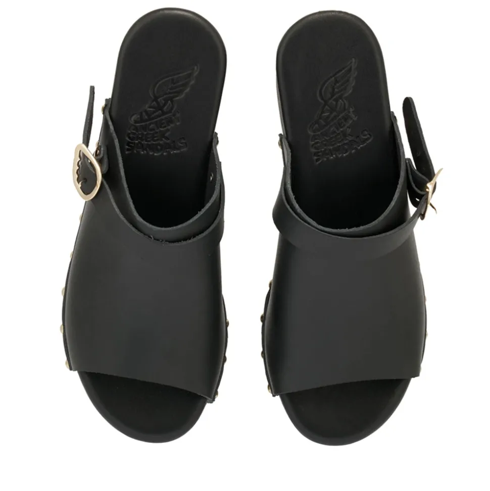 New for 2021, Ancient Greek Sandals gives the classic clog design a signature twist. Complete with a winged buckle at the side and gold studs through the sole, this open-toed pair features a small heel for an elevated look.