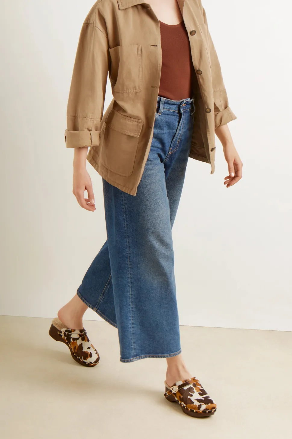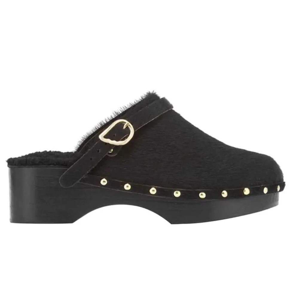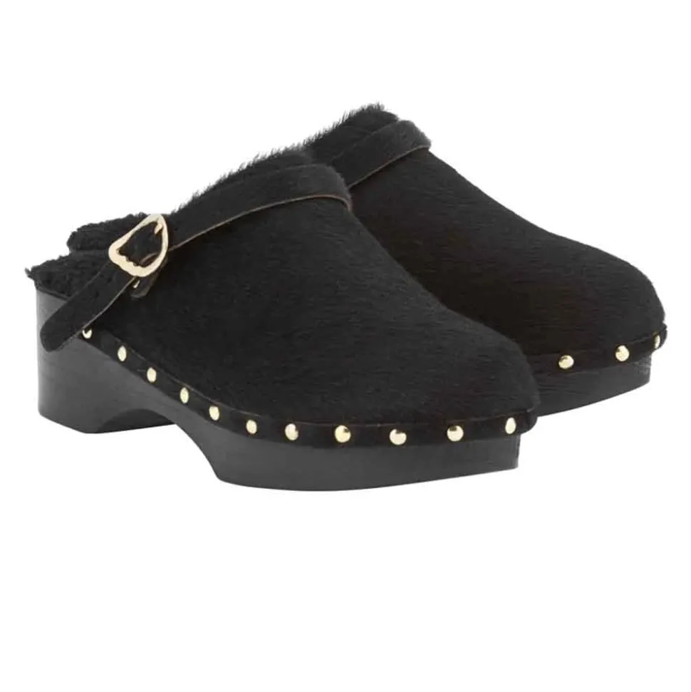 Our iconic clogs are making a comeback. The Classic Closed Clog is simple and effective, with its low platform, enclosed toe and detail strap with signature buckle. All our clogs feature a lightweight wooden sole, soft padded insole and anti-slip rubber grip for a comfortable, wearable clog. This version is crafted in pony hair and finished with studs – just choose your animal print, or opt for a chic plain black.