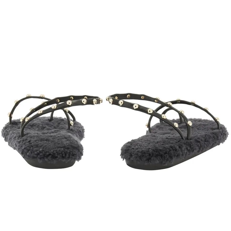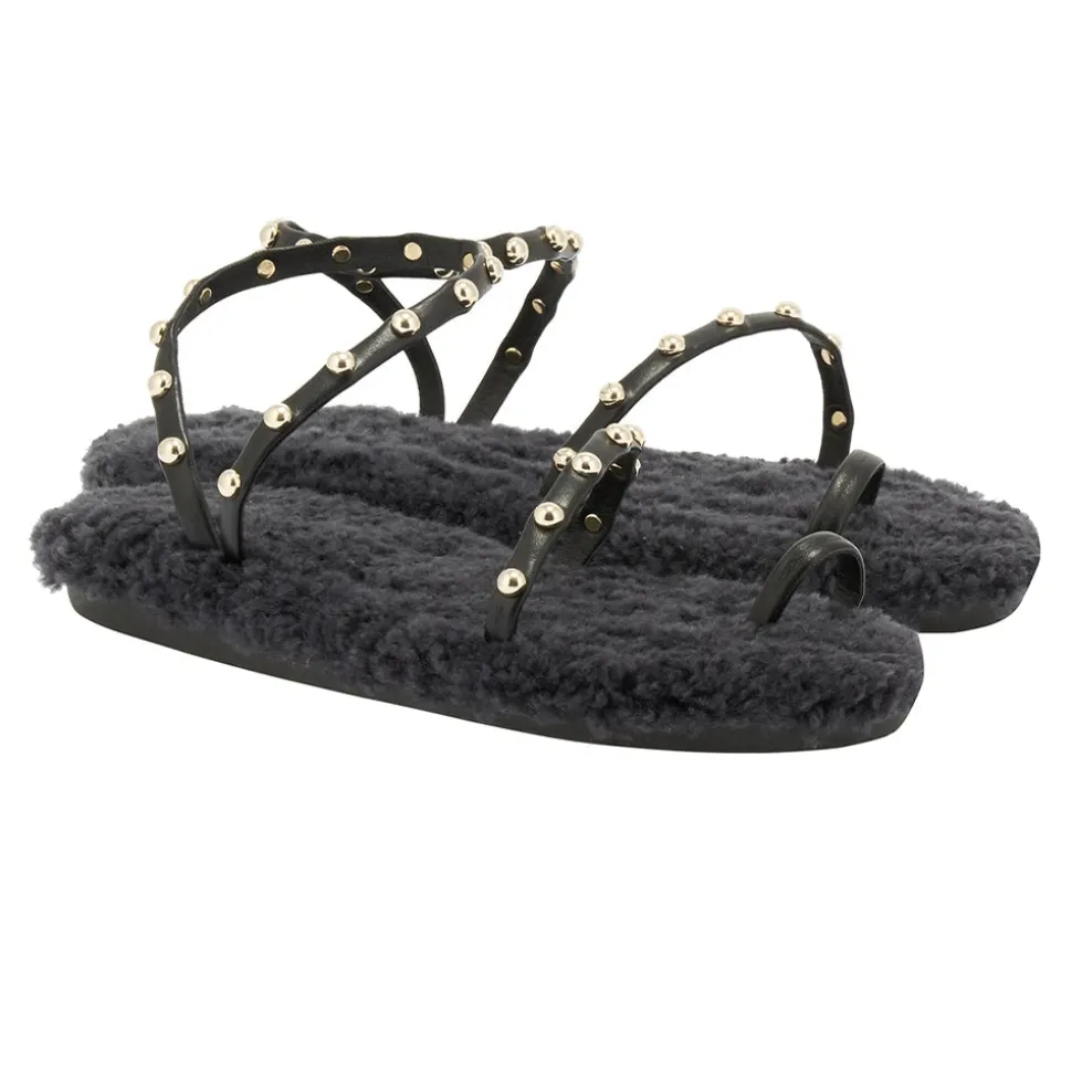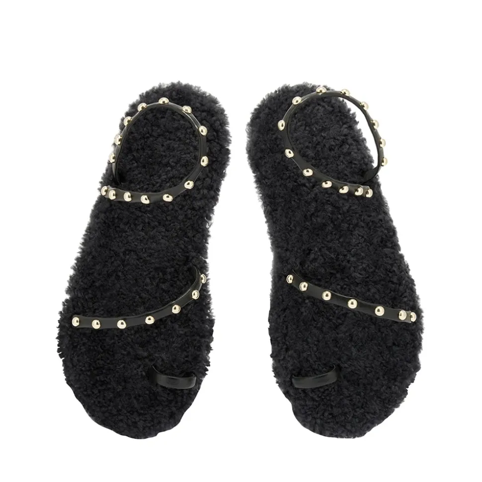 The barely-there Eleftheria sandal has a new trick: a sheepskin-lined cushioned insole. There’s a playful contrast between the studded nappa leather straps and the luxurious texture of the sheepskin, creating a head-turning style that’s a seasonal must. We love this style with a floor-sweeping dress for entertaining at home.