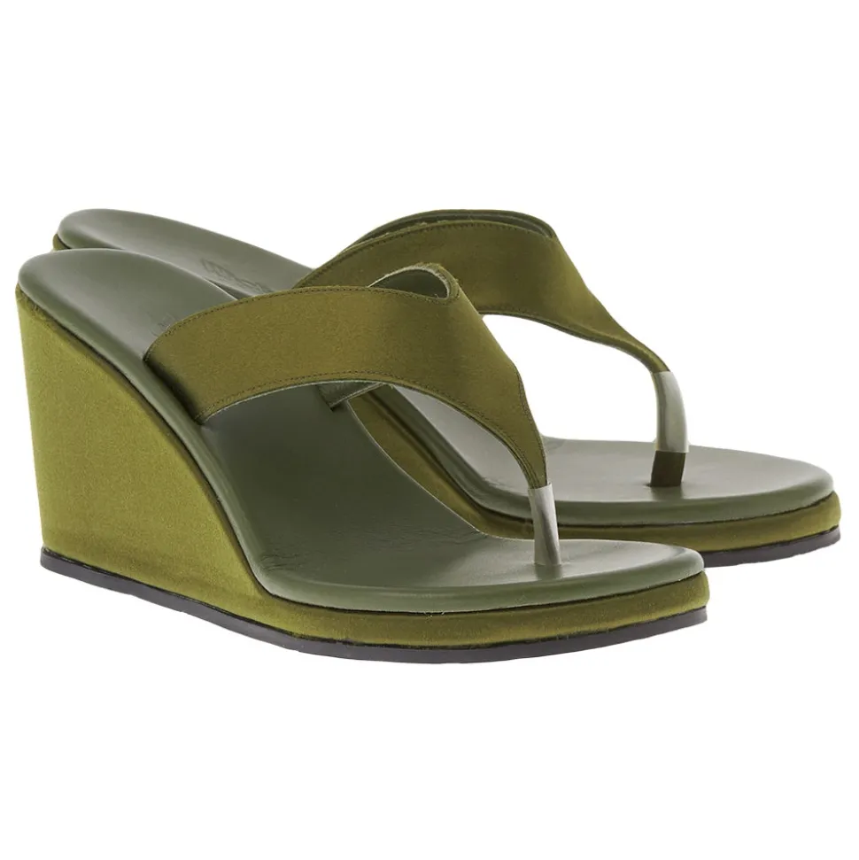 Introducing Elyria, a wide-strap flip-flop, or thong, style, with a high wedge sole. It’s crafted in luxurious satin in a palette of elegant shades, ideal for pairing with a summer suit or an evening dress.