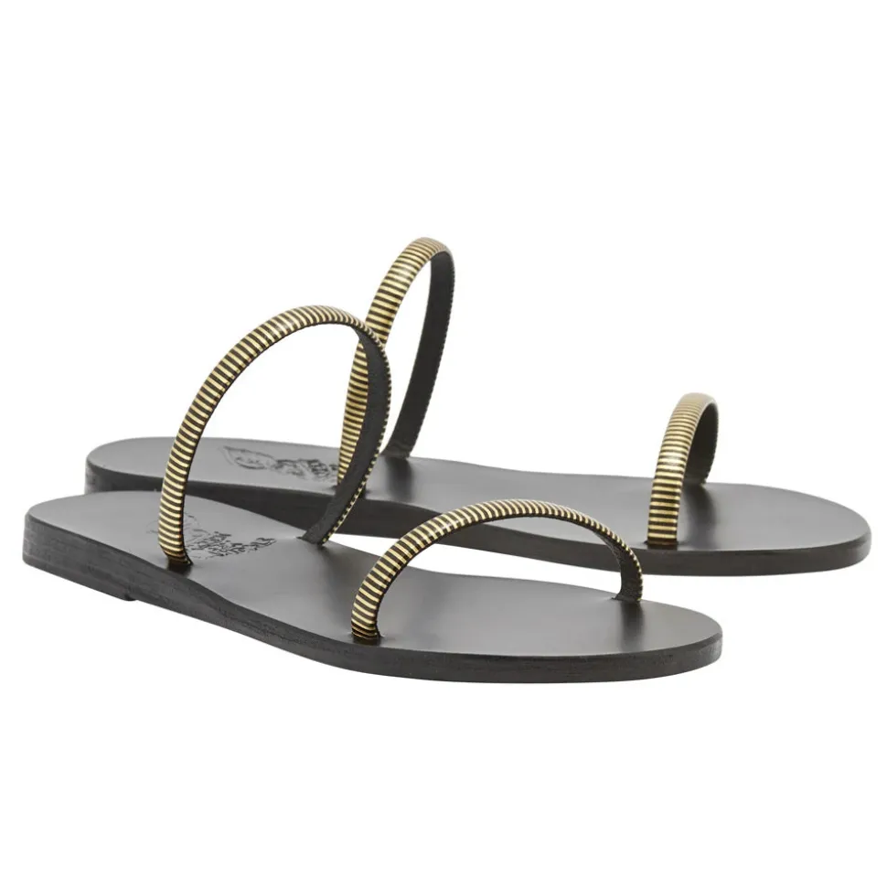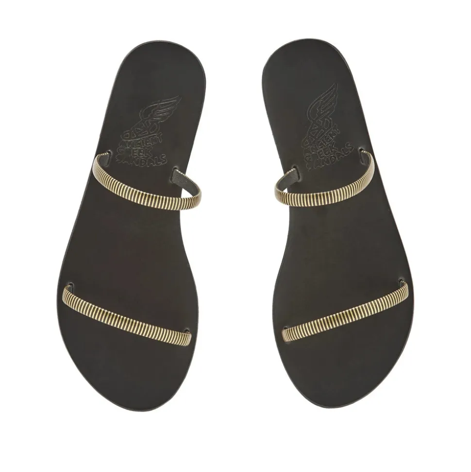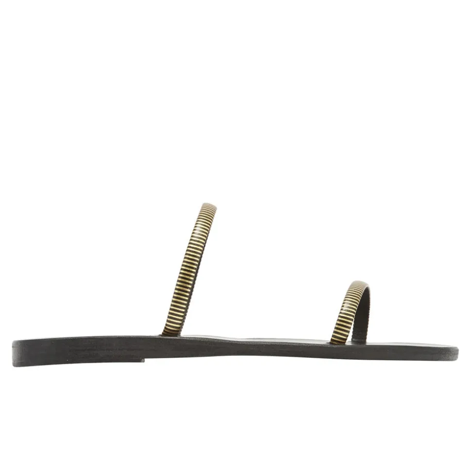 Meet your new favourite evening sandal. Gloria comprises two simple straps, crafted in faux leather and printed with a gold stripe for a luxurious but playful look. This is a sandal that wants to be shown a good time, so wear with your favourite evening pieces and prepare to dance.