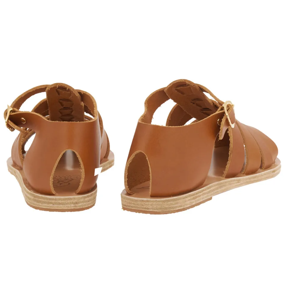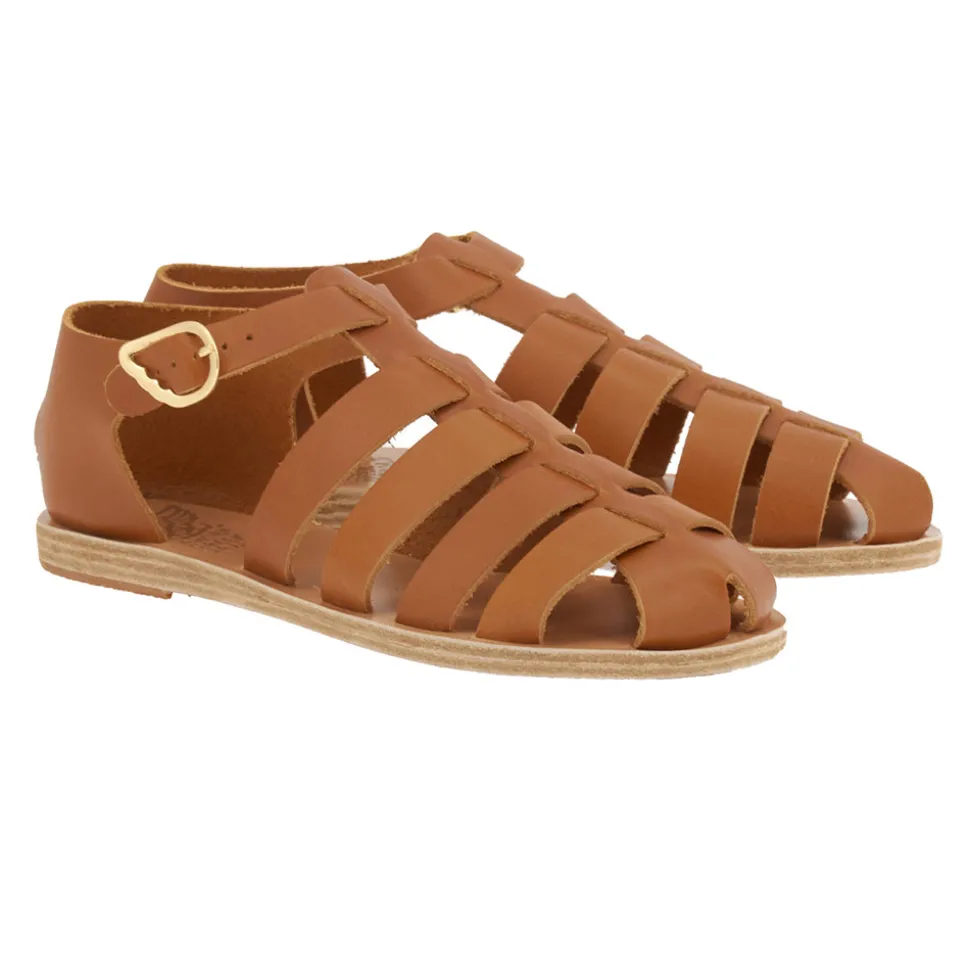 Our Homeria sandal is a classic closed toe style which features Ancient Greek Sandals signature gold wing buckle and is available in classic colors including natural, off white, black and platinum.