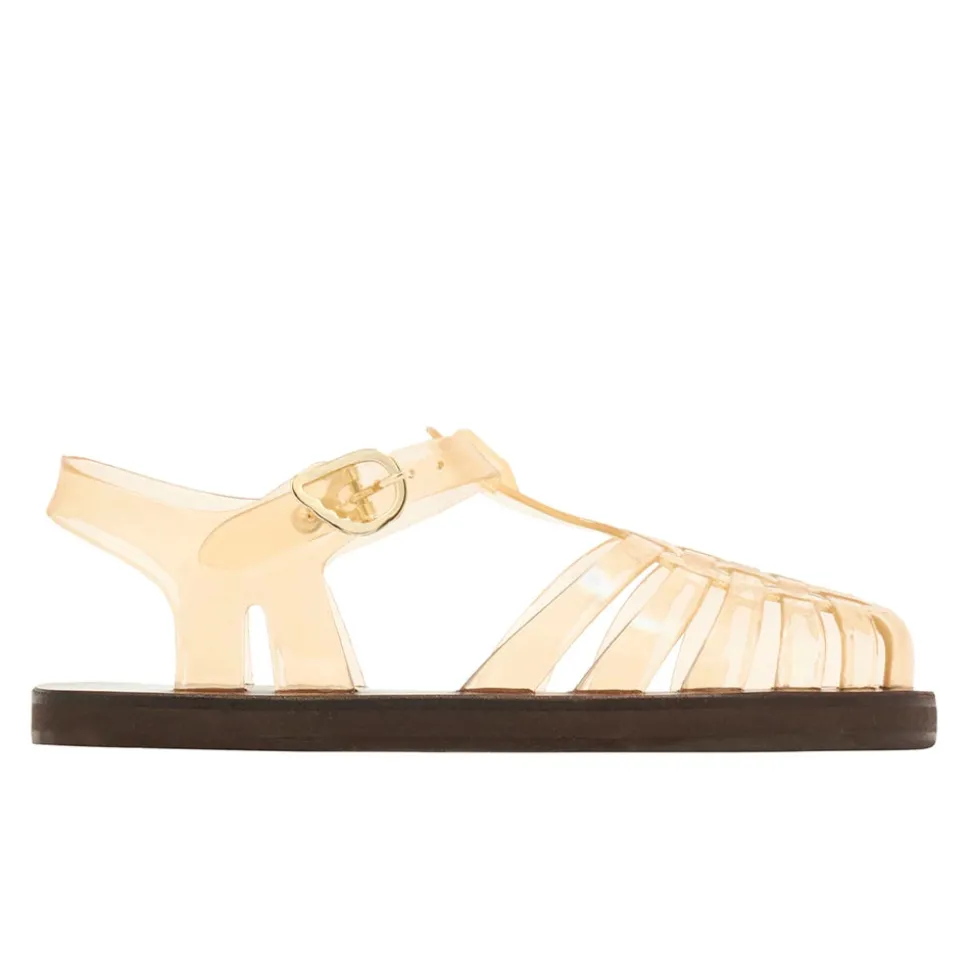 The Homeria is our classic fisherman-style sandal with a closed toe. The Homeria Jelly adds a shot of playfulness and nostalgia with its rubber upper and rainbow of colourways – just right for vacation days. Note the signature winged buckle to keep the foot secure, and the hand-stitched leather sole for stability.