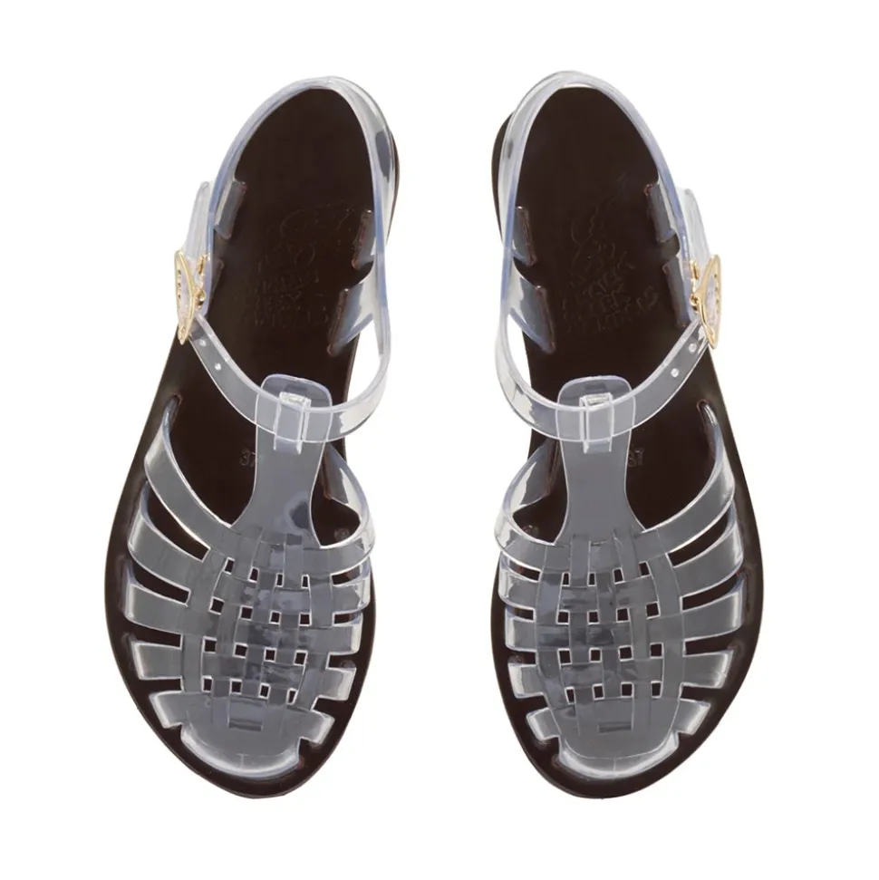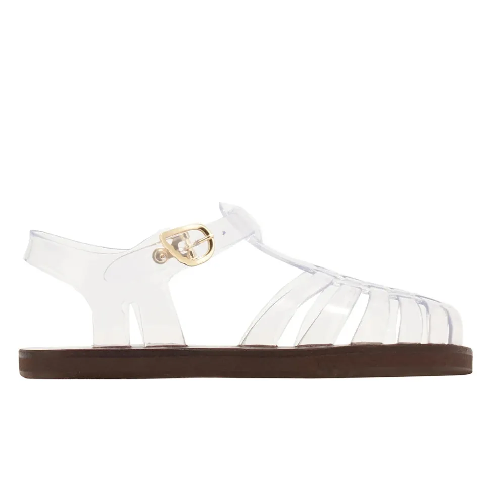 The Homeria is our classic fisherman-style sandal with a closed toe. The Homeria Jelly adds a shot of playfulness and nostalgia with its rubber upper and rainbow of colourways – just right for vacation days. Note the signature winged buckle to keep the foot secure, and the hand-stitched leather sole for stability.