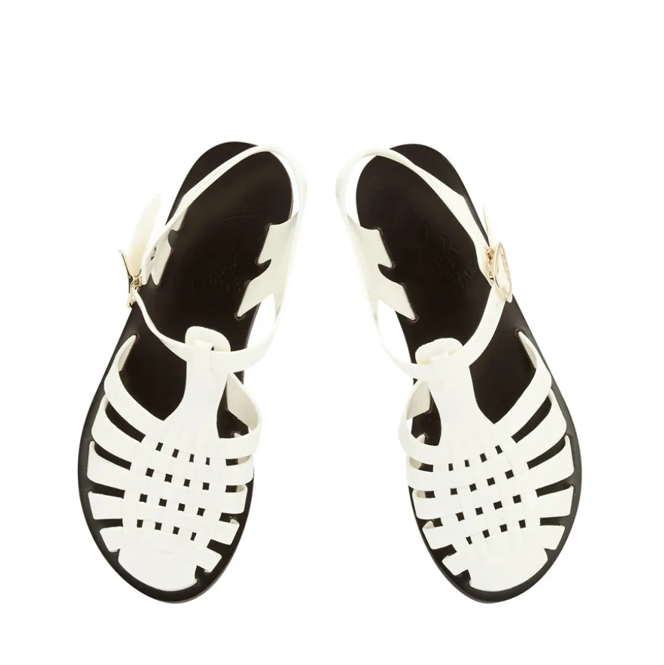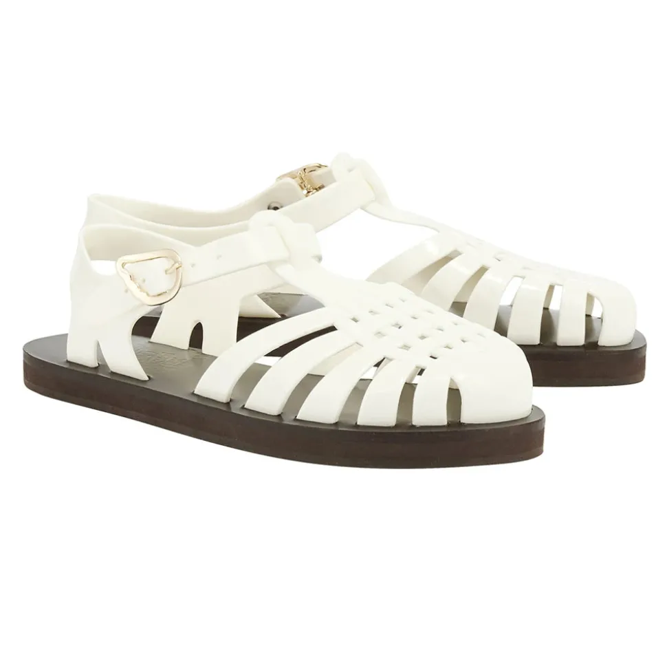 The Homeria is our classic fisherman-style sandal with a closed toe. The Homeria Jelly adds a shot of playfulness and nostalgia with its rubber upper and rainbow of colourways – just right for vacation days. Note the signature winged buckle to keep the foot secure, and the hand-stitched leather sole for stability.