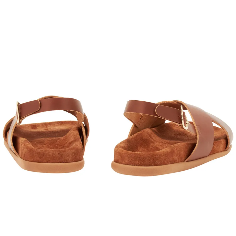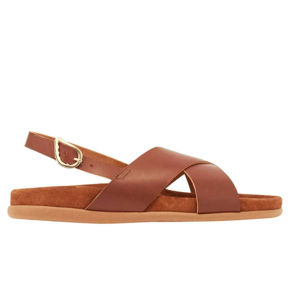 Ikesia is simple and streamlined – two wide bands cross over the foot, and a single slender strap holds the foot in place, with our signature winged buckle. The smooth leather version is available in several sophisticated shades. Ikesia is built on a Footbed sole: contoured, comfortable and covered in coordinating leather for a streamlined look.