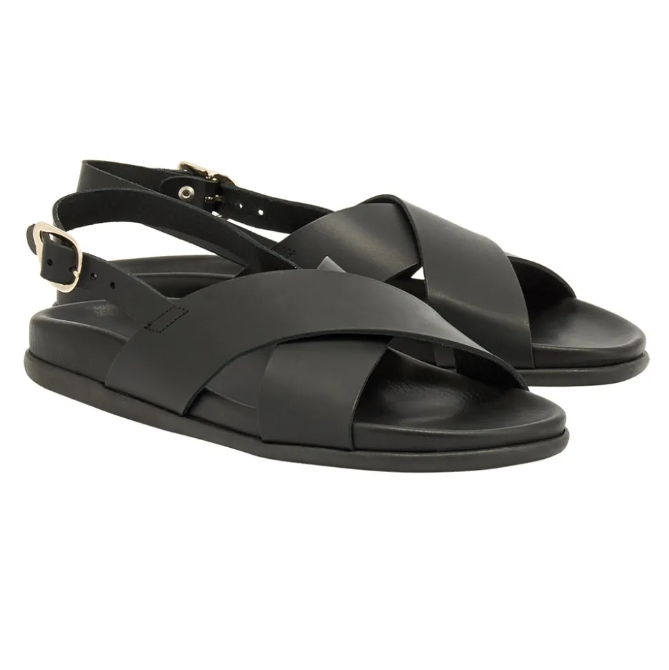 Ikesia is simple and streamlined – two wide bands cross over the foot, and a single slender strap holds the foot in place, with our signature winged buckle. The smooth leather version is available in several sophisticated shades. Ikesia is built on a Footbed sole: contoured, comfortable and covered in coordinating leather for a streamlined look.