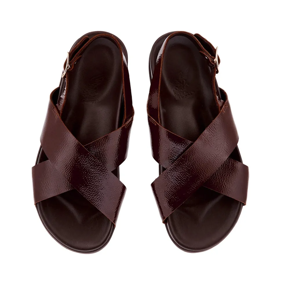 Ikesia is simple and streamlined – two wide bands cross over the foot, and a single slender strap holds the foot in place, with our signature winged buckle. This iteration incorporates our new footbed construction: we’ve redesigned this comfort-focused sole for enhanced anatomical support and all-day comfort, while making the shape more refined than ever – note the slimmer sole and elevated styling. One of our iconic styles, this version is constructed in Naplak leather, high-shine with a distinctive crinkled texture.