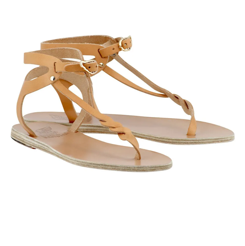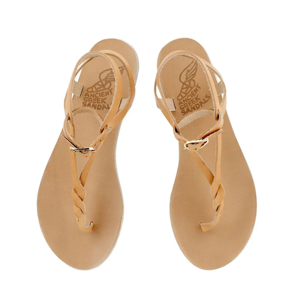Sculptural with a sweeping heel cut-out, this sandal is feminine without being decorative. The twisted front strap, stretching from toes to ankle, loops through the heel section creating a neat ankle strap, which fastens with our signature golden winged buckle. Wear with denim hotpants and a utility blouse for a retro-meets-function summer aesthetic.