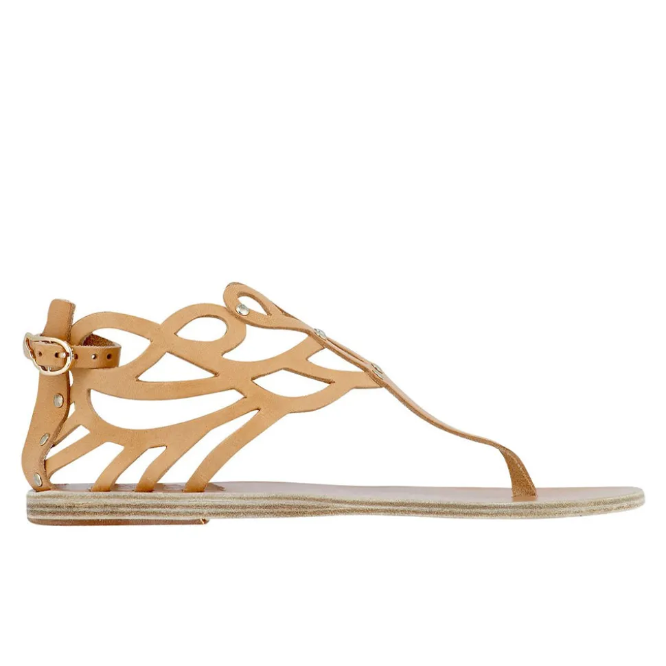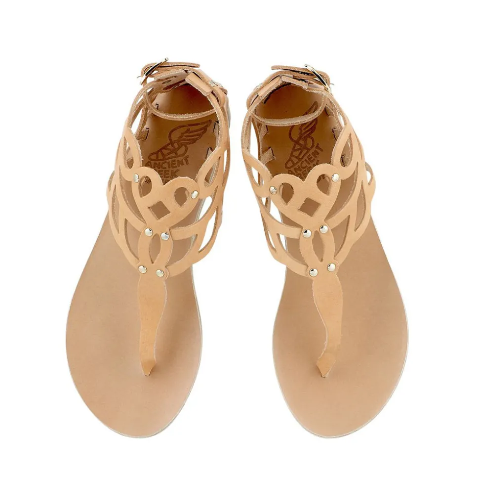 A network of looping leather cut-outs cover the foot, for a sandal that has been a firm favourite since the birth of our brand. With firm grounding in the loops and swirls of ancient Greek architecture, this style is as flattering as it is comfortable. Delicate silver studs affix the elegant central column, from the toes to the ankle, creating a sandal that’s just as wearable for dancing nights as for lazy days.