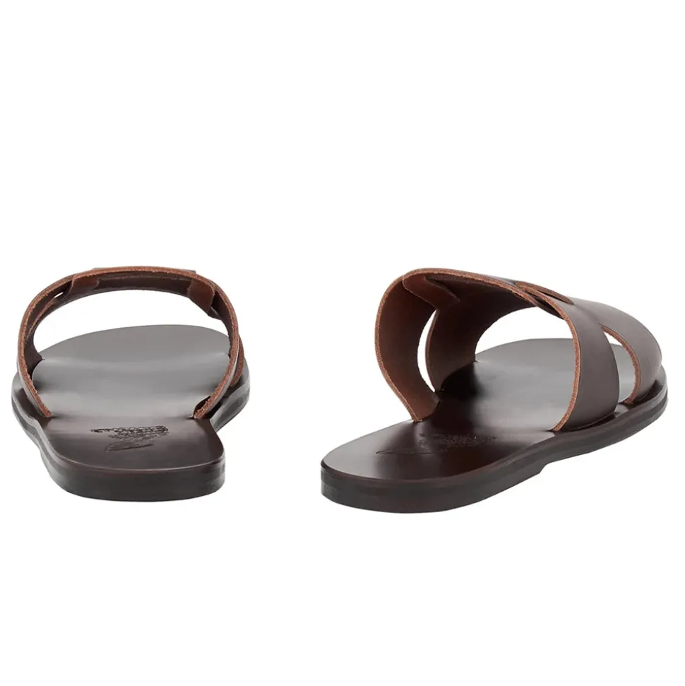 Slip into Miltiadis. A wide band of leather is shaped and cut to accommodate a bisecting second band of black leather, which weaves through to create a simple, architectural design. The streamlined sole keeps the silhouette light. A versatile and timeless style.