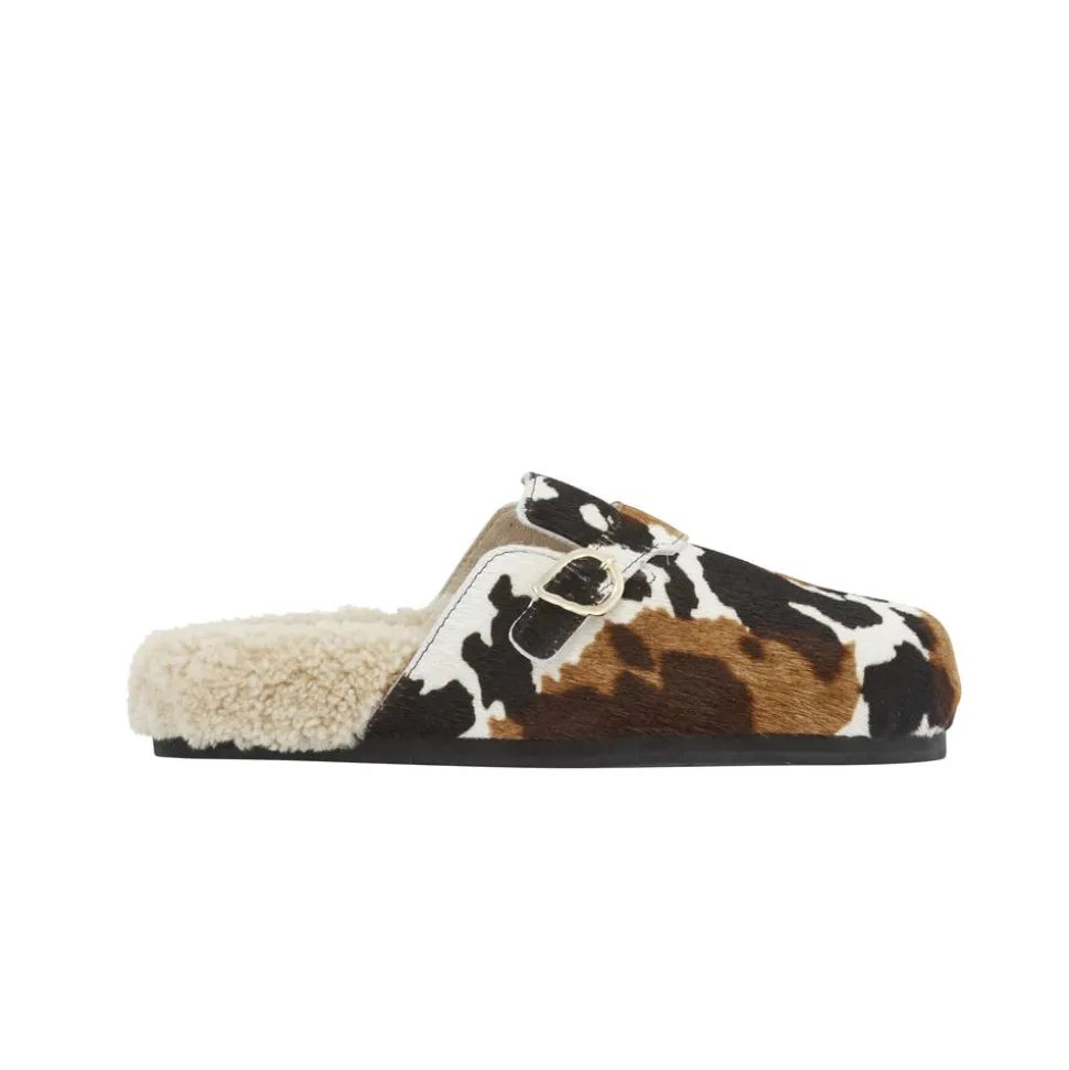 Meet Vasilitsa – robust enough to take you around town, comfortable enough to make you wonder if you really need to leave home at all. The cocooning footbed is lined in sheepskin, and the rounded closed toe is crafted in pony hair and finished with an accent strap and signature wing-shape buckle. Choose from sophisticated black or statement cow print.