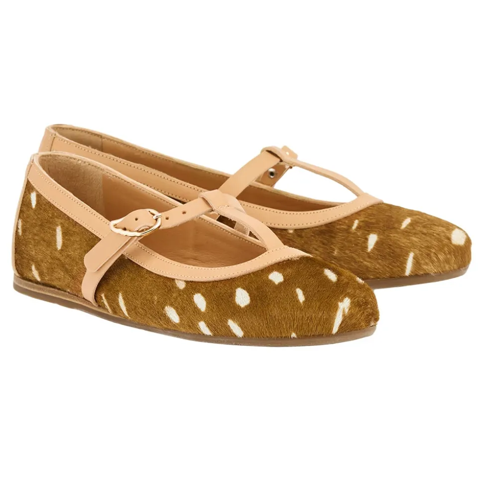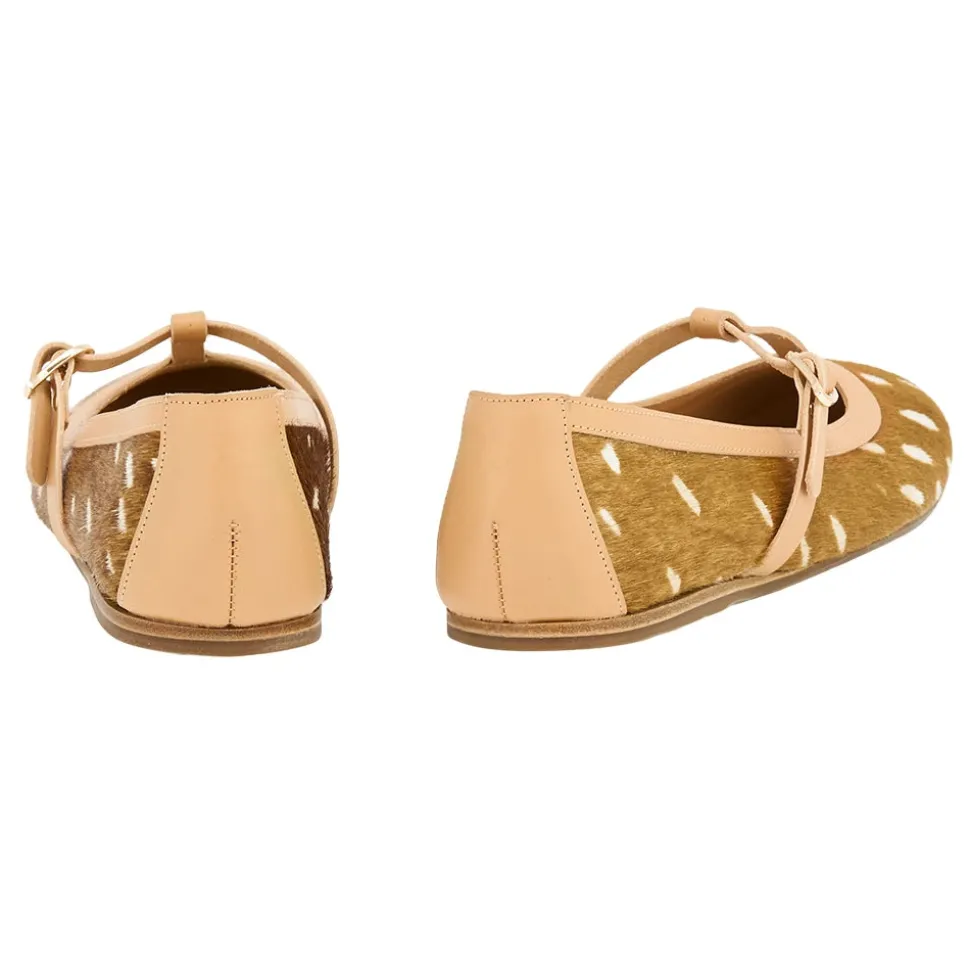 The ballerina is back. Our bestselling Aerati style features a feminine T-strap across the front and combines Vachetta leather construction with pony hair uppers. Choose from several animal prints. Note the signature wing-shaped buckle for adjustments.