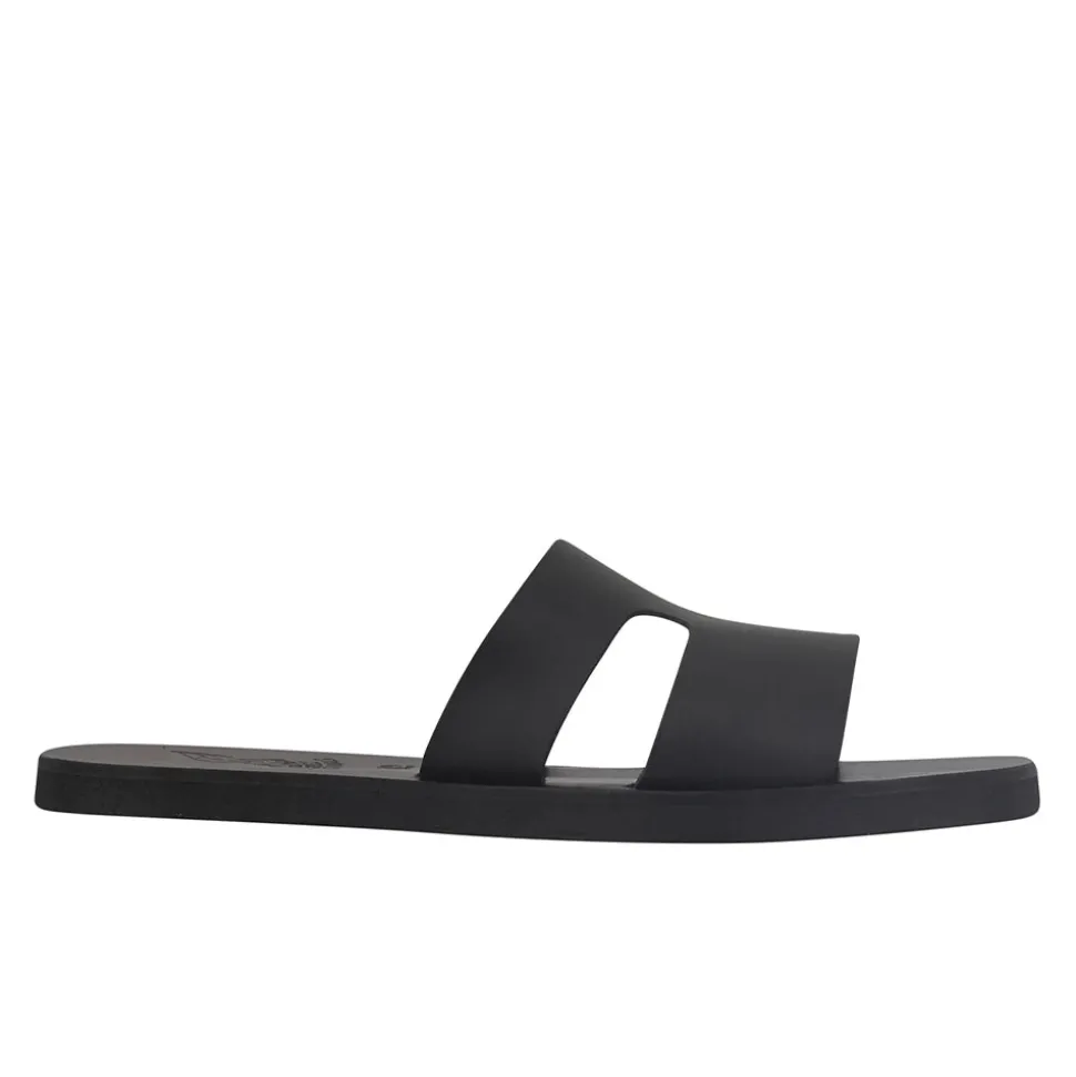 This simple slide is designed to be minimalist with a twist: note the cut-out details. Built on a textured rubber sole, comfort is paramount. Like all our sandals, Apteros is handcrafted in Greece in the finest leather; the raw edges and heat-stamped logo in the heel are the details that make the difference. Apteros is at home by the pool with simple swim shorts, or you can add your favourite relaxed tailoring for events like weddings and dinners. A staple sandal.
