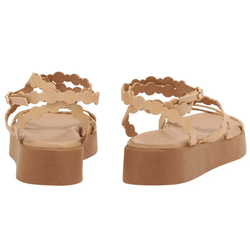 Aspis is built on our Wave sole: an elevated rubber sole with wave detailing that is perfect for all-day-long height and support. Its moulded padded insole is covered with soft leather and the aesthetic is bold but refined. Aspis is finished with a handcrafted leather upper which wraps across the foot and around the ankle, fastening with our signature bow. The alternating circle motif is a whimsical touch. Wear with denim in the city of maxi dresses for vacation evenings out.