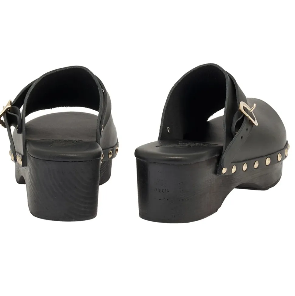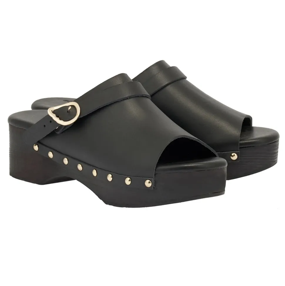 New for 2021, Ancient Greek Sandals gives the classic clog design a signature twist. Complete with a winged buckle at the side and gold studs through the sole, this open-toed pair features a small heel for an elevated look.