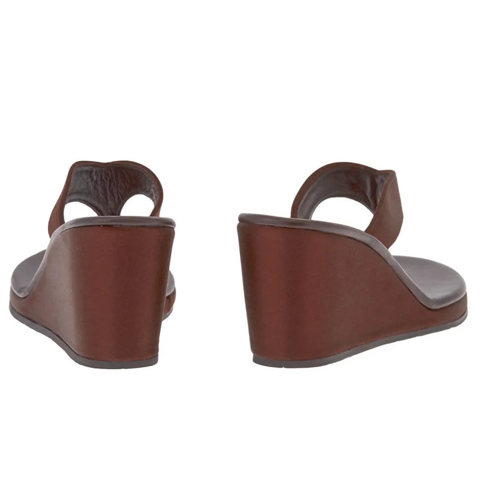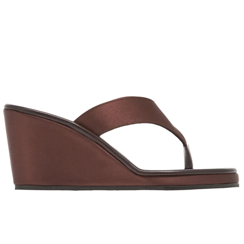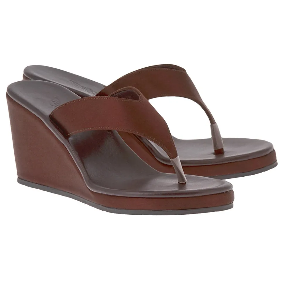 Introducing Elyria, a wide-strap flip-flop, or thong, style, with a high wedge sole. It’s crafted in luxurious satin in a palette of elegant shades, ideal for pairing with a summer suit or an evening dress.