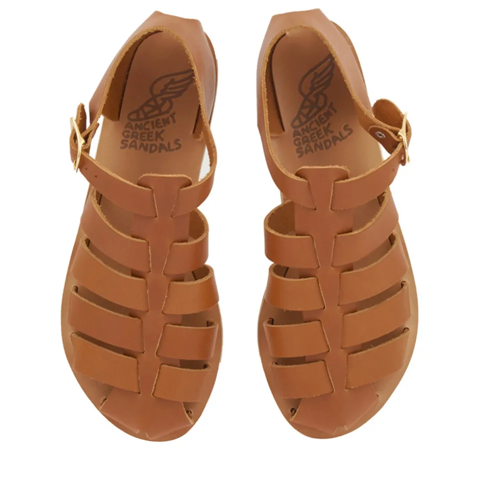 Our Homeria sandal is a classic closed toe style which features Ancient Greek Sandals signature gold wing buckle and is available in classic colors including natural, off white, black and platinum.