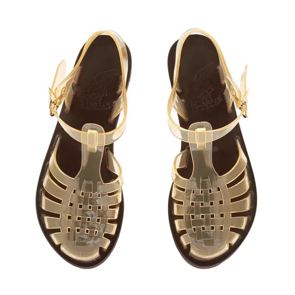 The Homeria is our classic fisherman-style sandal with a closed toe. The Homeria Jelly adds a shot of playfulness and nostalgia with its rubber upper and rainbow of colourways – just right for vacation days. Note the signature winged buckle to keep the foot secure, and the hand-stitched leather sole for stability.