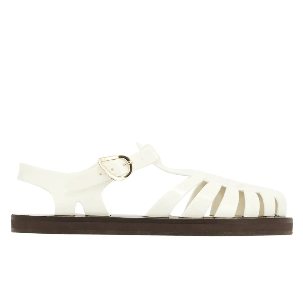 The Homeria is our classic fisherman-style sandal with a closed toe. The Homeria Jelly adds a shot of playfulness and nostalgia with its rubber upper and rainbow of colourways – just right for vacation days. Note the signature winged buckle to keep the foot secure, and the hand-stitched leather sole for stability.