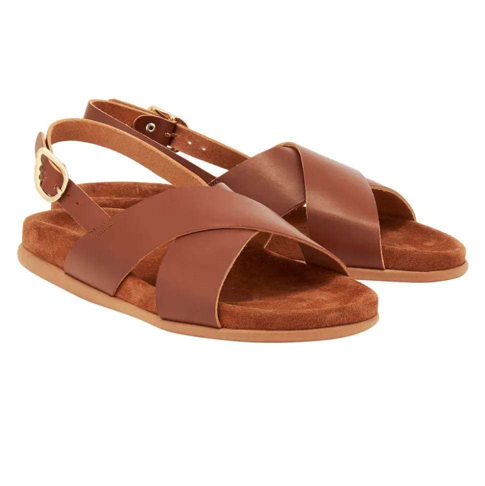 Ikesia is simple and streamlined – two wide bands cross over the foot, and a single slender strap holds the foot in place, with our signature winged buckle. The smooth leather version is available in several sophisticated shades. Ikesia is built on a Footbed sole: contoured, comfortable and covered in coordinating leather for a streamlined look.