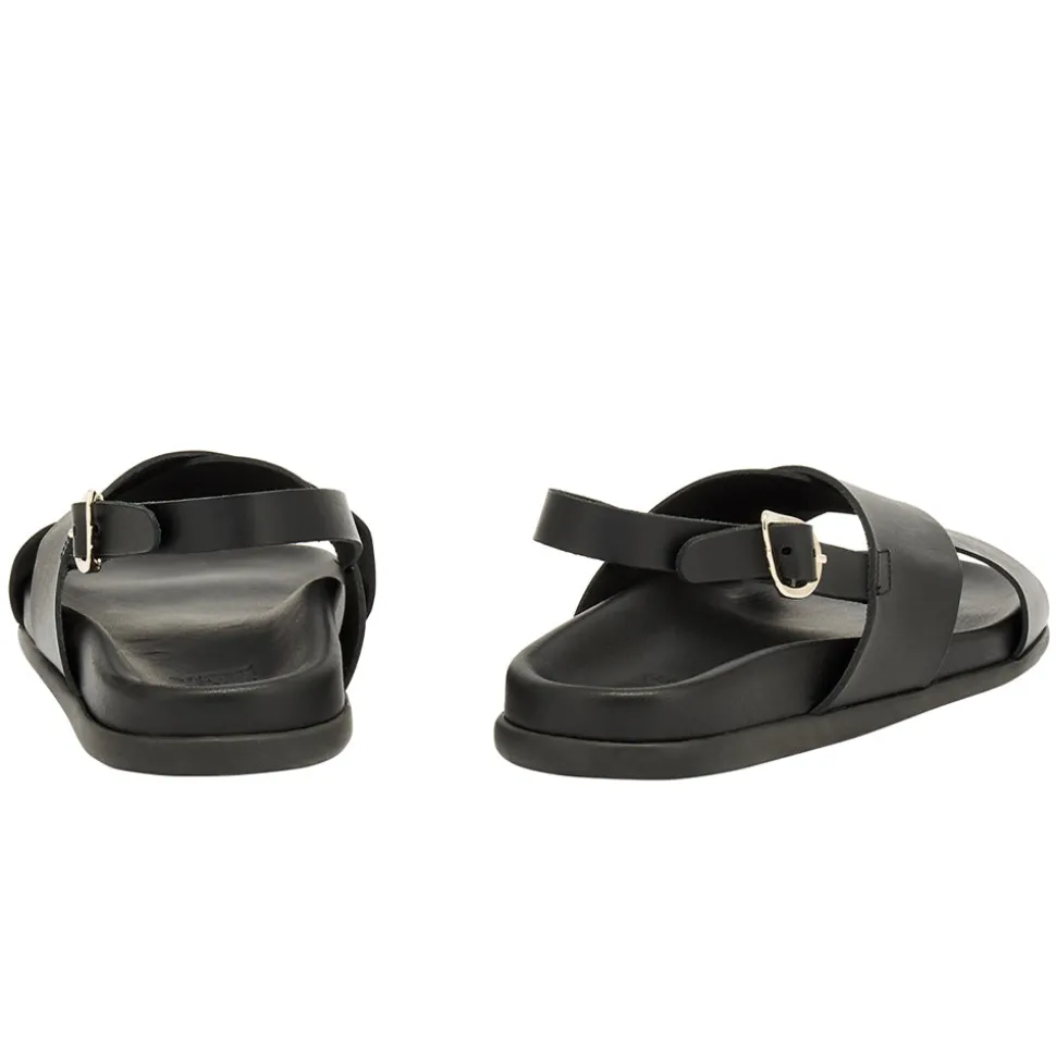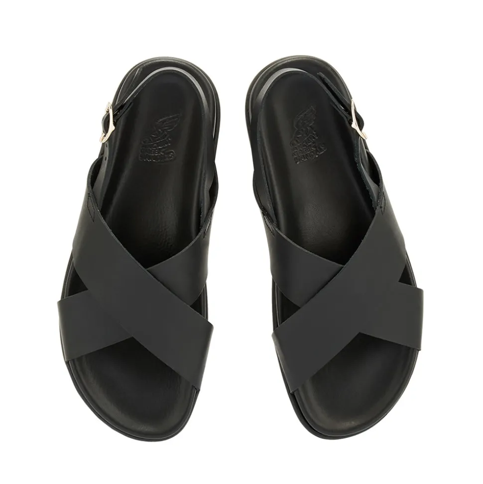 Ikesia is simple and streamlined – two wide bands cross over the foot, and a single slender strap holds the foot in place, with our signature winged buckle. The smooth leather version is available in several sophisticated shades. Ikesia is built on a Footbed sole: contoured, comfortable and covered in coordinating leather for a streamlined look.
