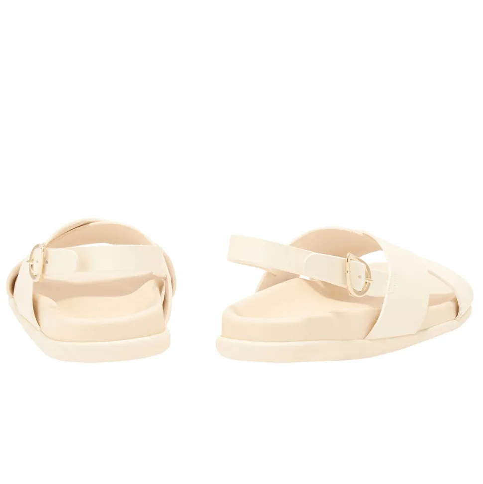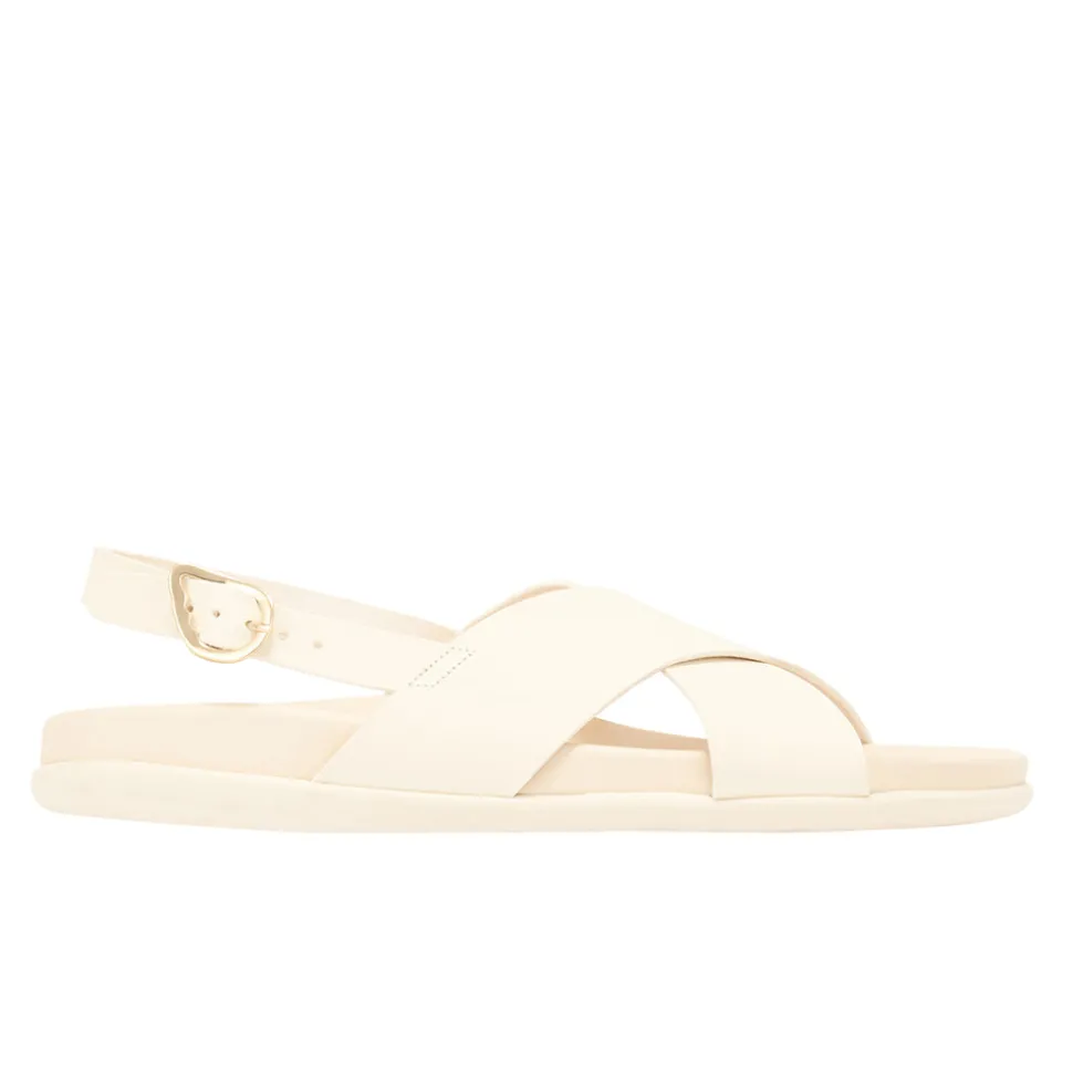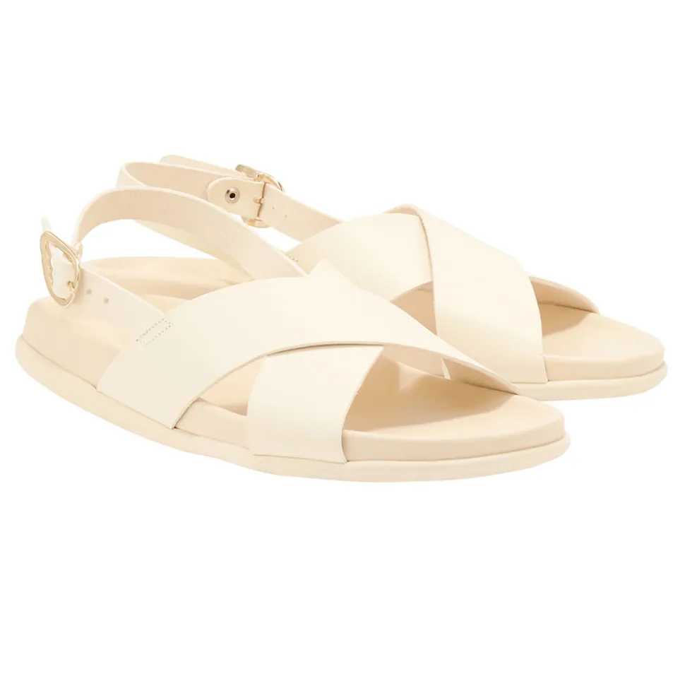 Ikesia is simple and streamlined – two wide bands cross over the foot, and a single slender strap holds the foot in place, with our signature winged buckle. The smooth leather version is available in several sophisticated shades. Ikesia is built on a Footbed sole: contoured, comfortable and covered in coordinating leather for a streamlined look.