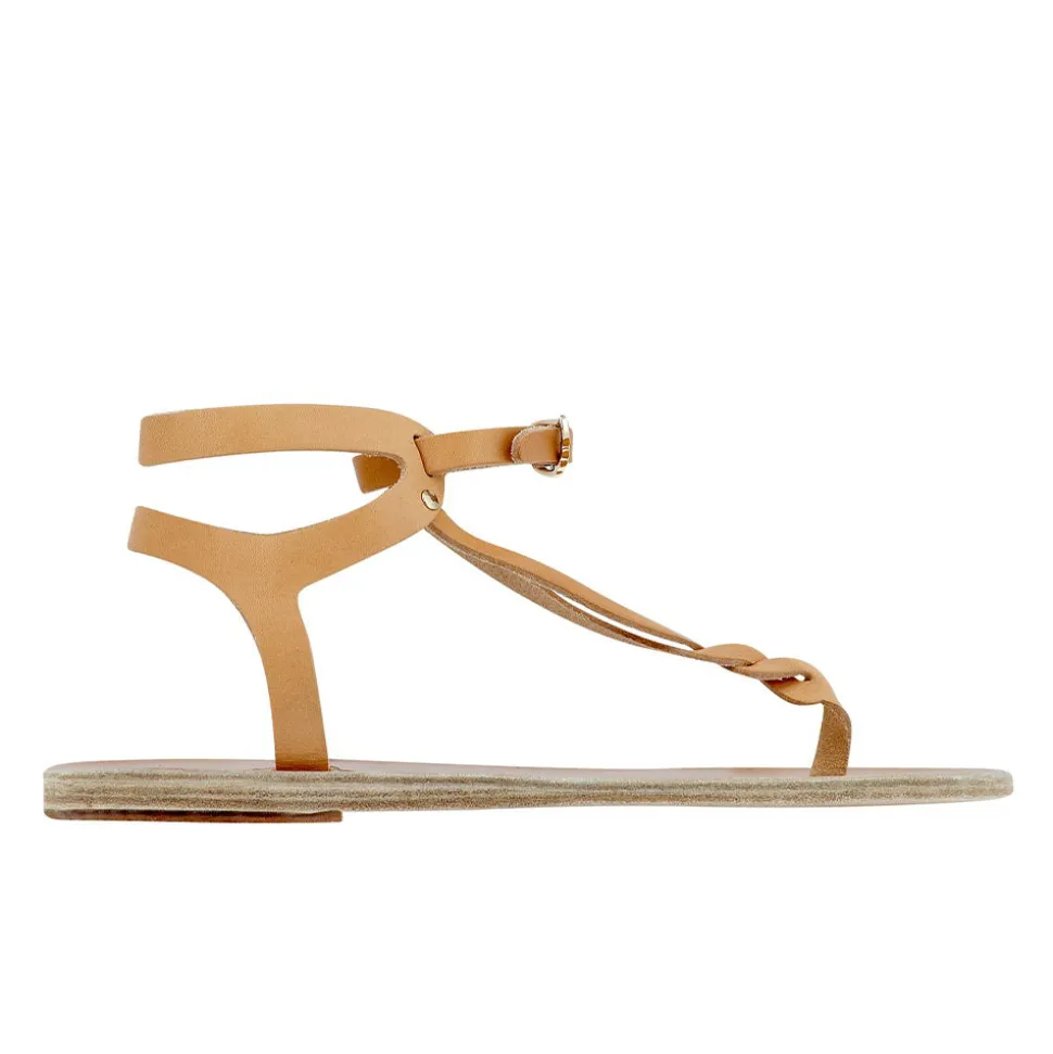 Sculptural with a sweeping heel cut-out, this sandal is feminine without being decorative. The twisted front strap, stretching from toes to ankle, loops through the heel section creating a neat ankle strap, which fastens with our signature golden winged buckle. Wear with denim hotpants and a utility blouse for a retro-meets-function summer aesthetic.