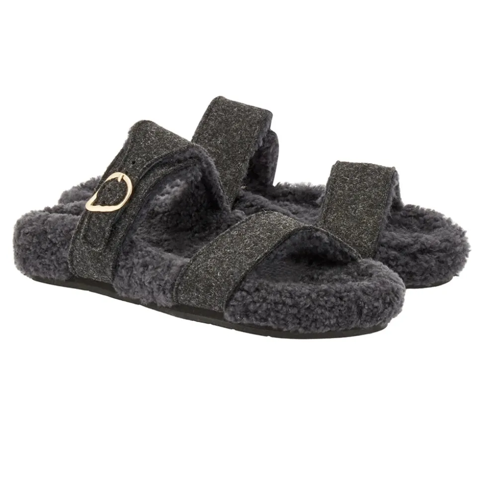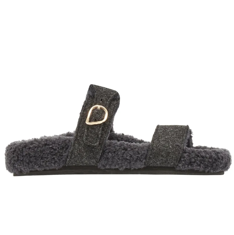 Slip into the Latria – and relax. Our double-strap slide has felt straps and a footbed lined in sheepskin, for an equally sumptuous feel whether you’re running errands in the city or entertaining at home. Choose your shade from a palette of soft neutrals and pair with your softest socks. Note the signature wing-shaped buckle for adjustments.