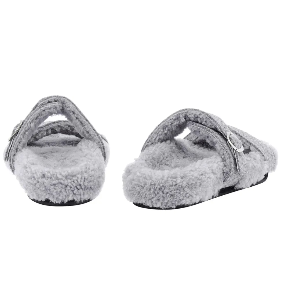 Slip into the Latria – and relax. Our double-strap slide has felt straps and a footbed lined in sheepskin, for an equally sumptuous feel whether you’re running errands in the city or entertaining at home. Choose your shade from a palette of soft neutrals and pair with your softest socks. Note the signature wing-shaped buckle for adjustments.