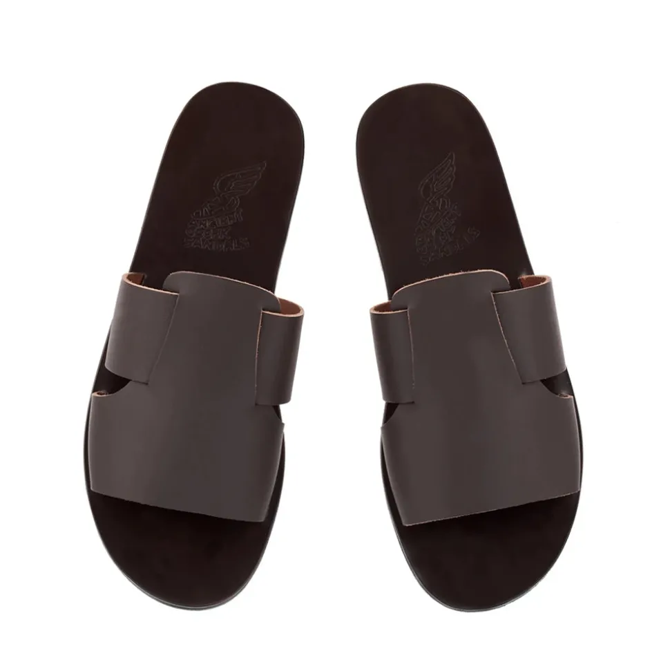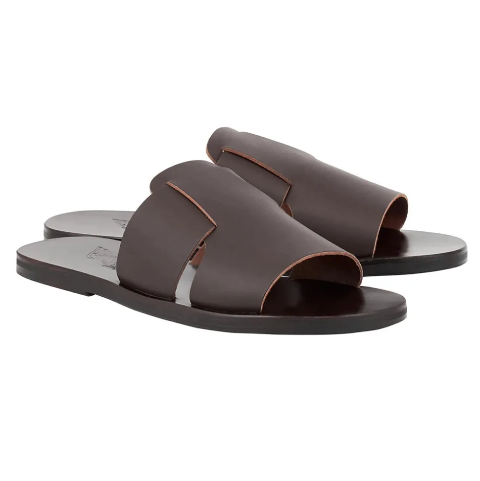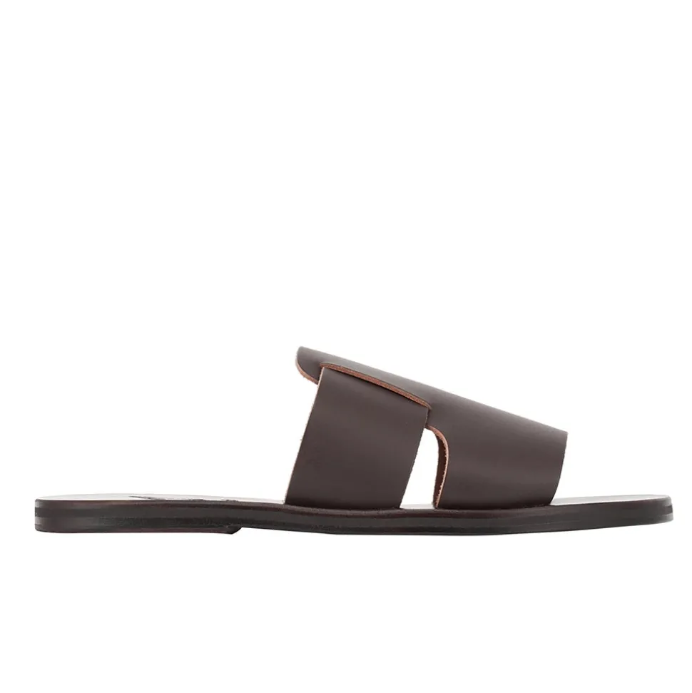 Slip into Miltiadis. A wide band of leather is shaped and cut to accommodate a bisecting second band of black leather, which weaves through to create a simple, architectural design. The streamlined sole keeps the silhouette light. A versatile and timeless style.