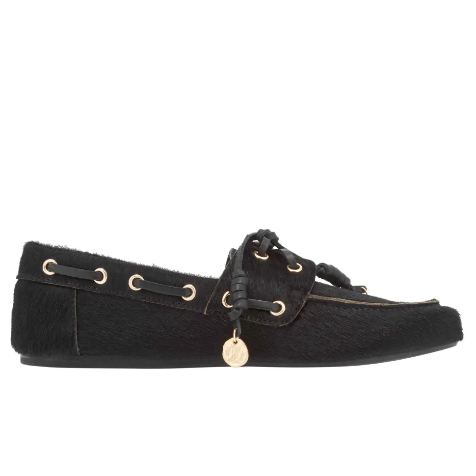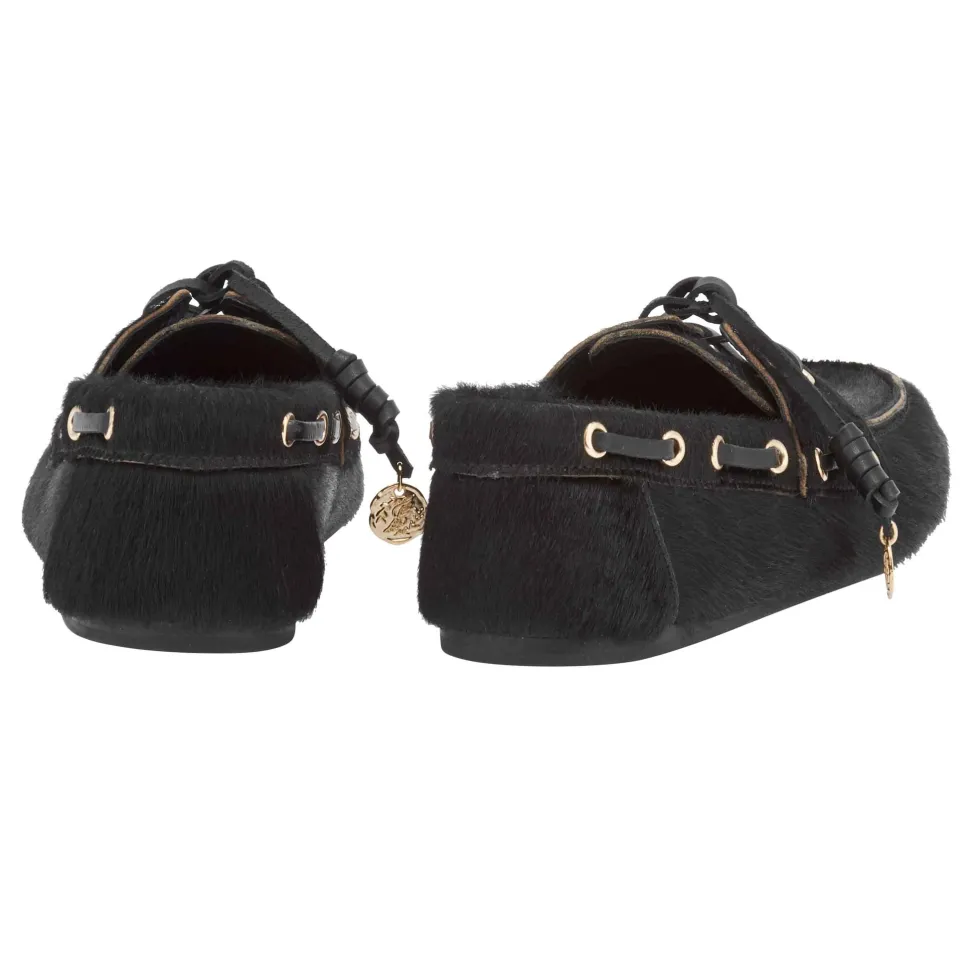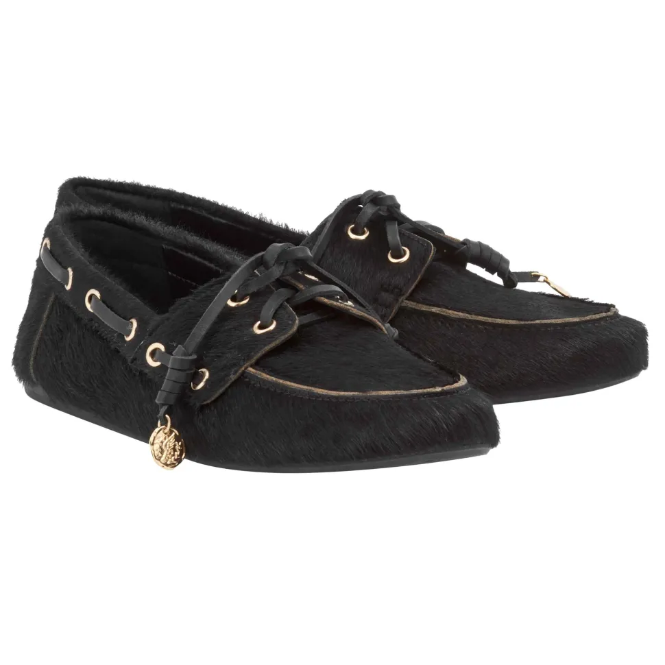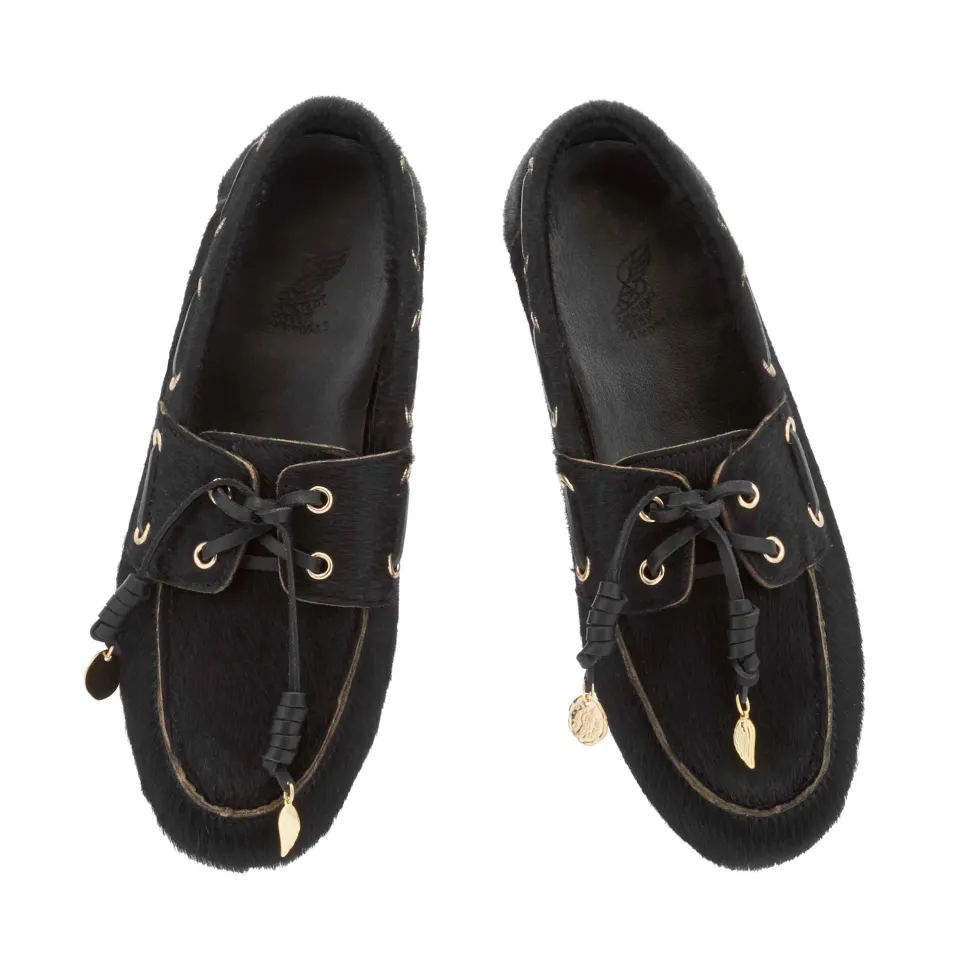 Named after the Greek word for boat, Pliaria takes the traditional preppy style and gives it a laid-back – but highly desirable – feel. Handmade in Greece to a typical boat-shoe shape, the style is given a twist with a pony-hair fabrication and distinctive leather laces rolled to form a special knot (inspired by the father of our creative director, Christina Martini), and finished with gold charms hanging from the laces. Choose a patterned pair – Cow, Lynx or Bambi – or opt for plain black. Already a must-have style, Pliaria adds insouciance to dresses or tailoring, or pairs beautifully with weekend favourites.