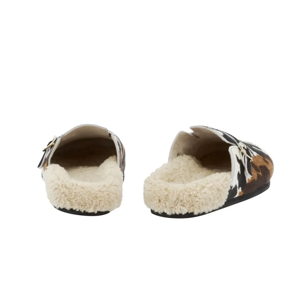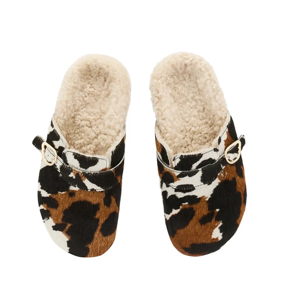 Meet Vasilitsa – robust enough to take you around town, comfortable enough to make you wonder if you really need to leave home at all. The cocooning footbed is lined in sheepskin, and the rounded closed toe is crafted in pony hair and finished with an accent strap and signature wing-shape buckle. Choose from sophisticated black or statement cow print.